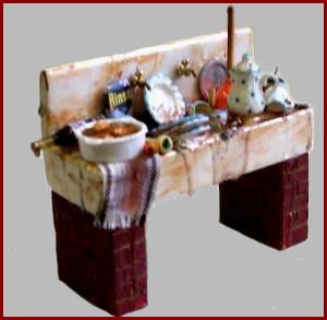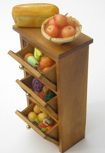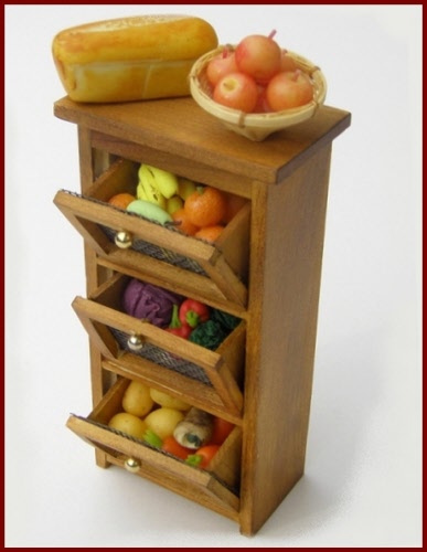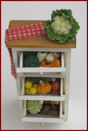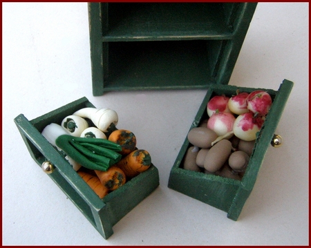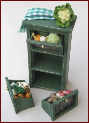 Vegetable storage safe in shabby green finish, with three tilting bins. Each bin is filled with a variety of vegetables. The bins can be removed, but all of the vegetables are glued in place in the bin.
