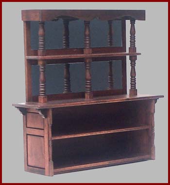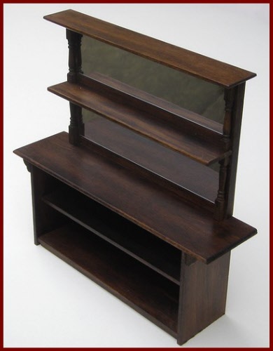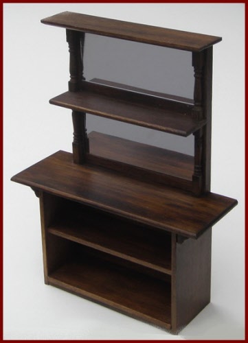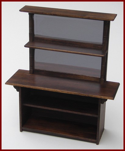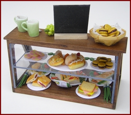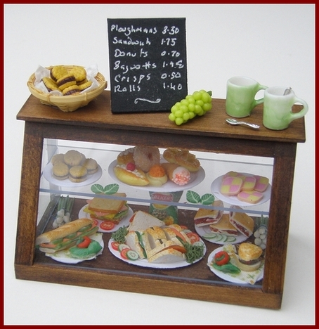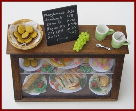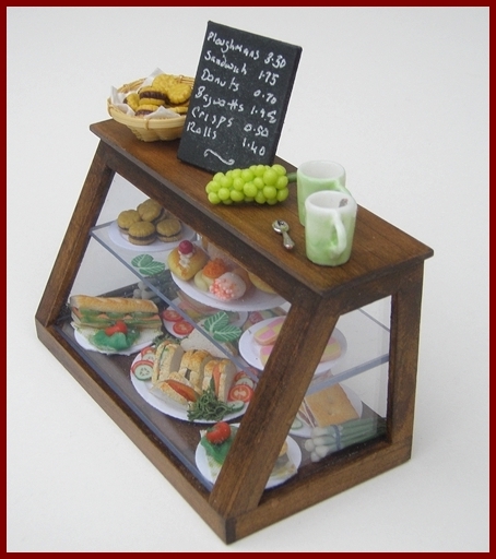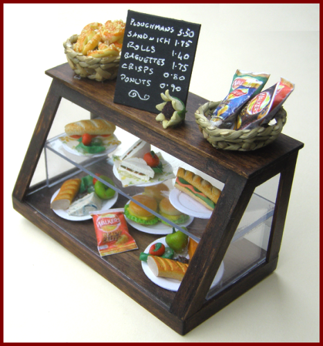 Snack display in walnut finish, to stand on a counter. Display contains a variety of hand made food and snacks. As this is a one of a kind hand made item the contents and arrangement of each display may vary from that pictured