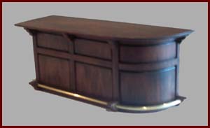 Hand made and polished bar counter with inset panelling, brass foot rail and rounded end to the right, as seen from front