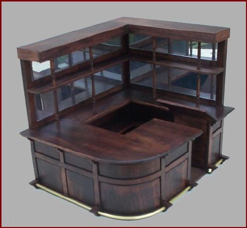 Hand made & polished 'L' shaped corner bar unit, with curved front, brass foot rail.